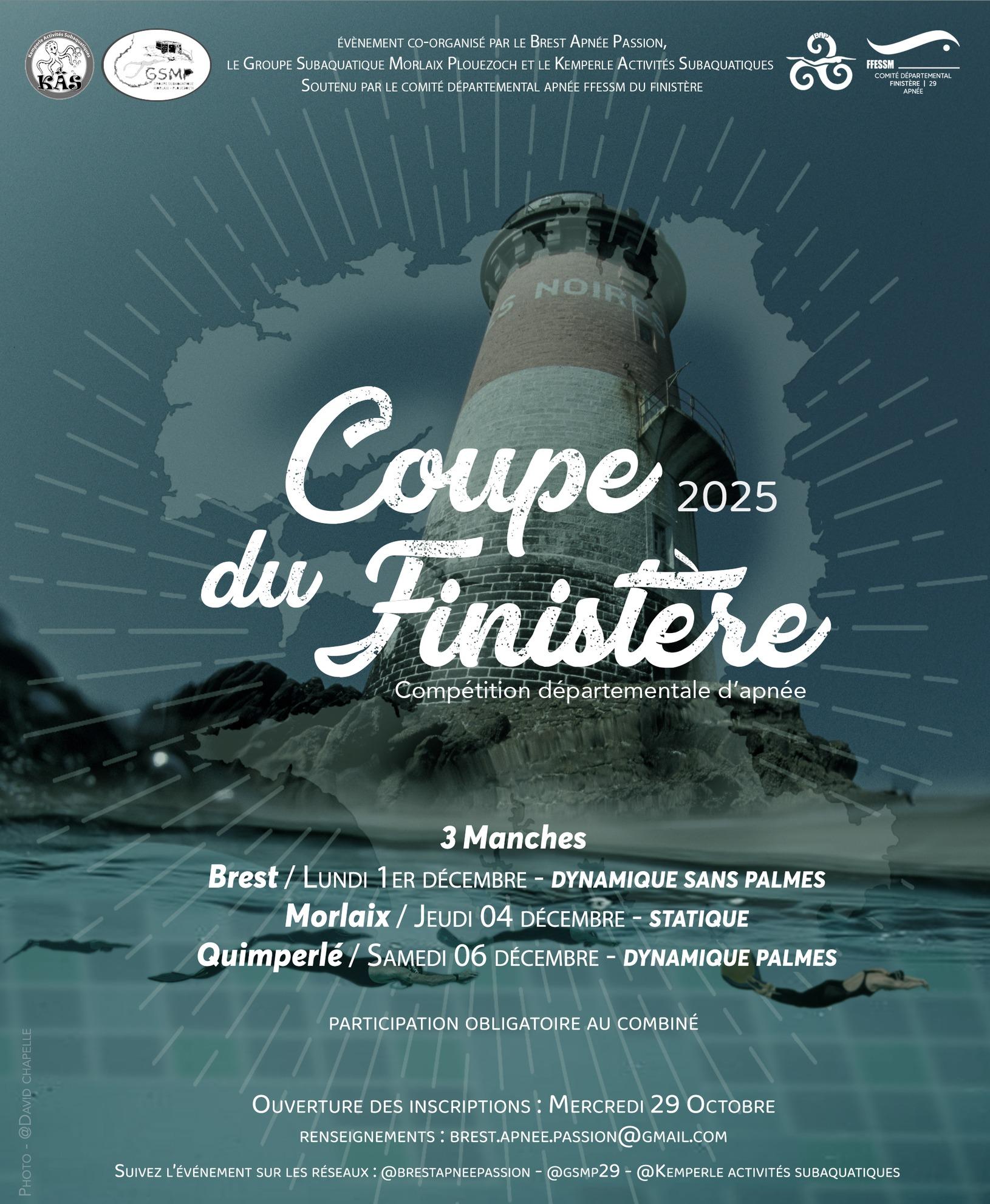 Née de l'expérience du BAP dans l'organisation de compétitions nationales et de l'envie de favoriser une dynamique Locale, en partenariat avec le Groupe Subaquatique Morlaix Plouezoc'h et Kemperlé Activités Subaquatique, voici la toute première "Coupe du Finistère", compétition départementale d'apnée !
